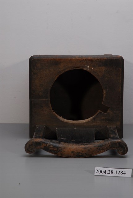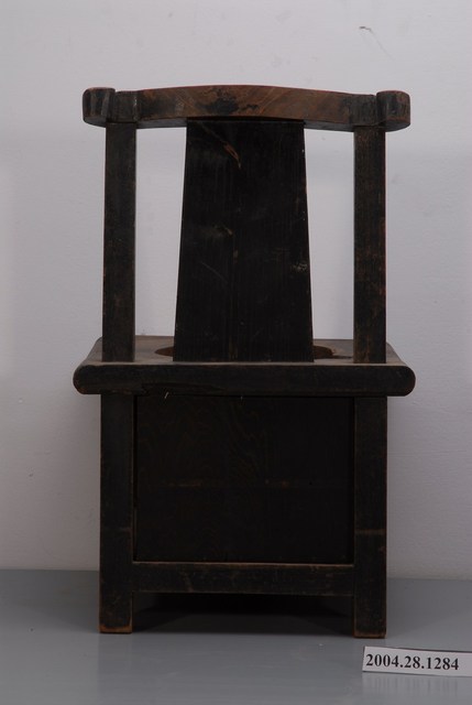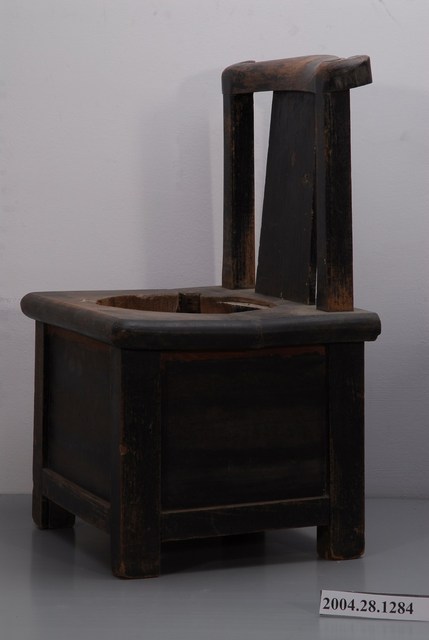本藏品為木製馬桶椅,是傳統社會富貴人家所使用的便器,長37公分、寬32.8公分,高59.7公分,整體木製,做有靠背,椅身為方形,椅面開有圓孔,下方應放置便桶承接排泄物,但現以丟失不見。通體施以黑漆,無其他裝飾。