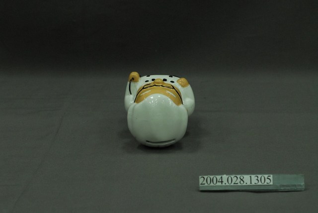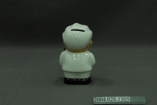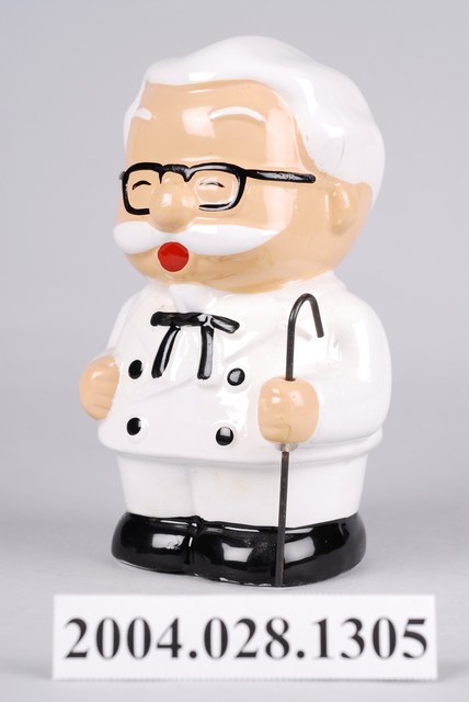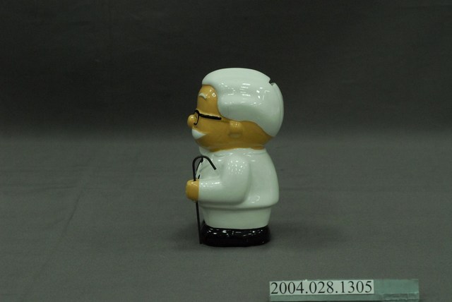 1.本物件為速食餐廳肯德基之存錢筒,陶瓷材質。該物件乃肯德基叔叔之陶瓷存錢筒,外觀為一名佩戴眼鏡之年長男性,面帶微笑,身著成套白色西裝、黑鞋,胸前繫有黑色領結及四個黑色鈕扣,左手持有黑色細拐杖。