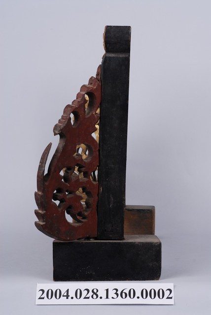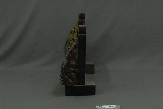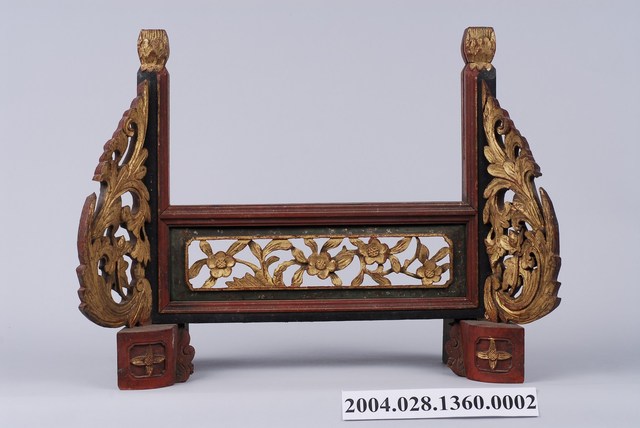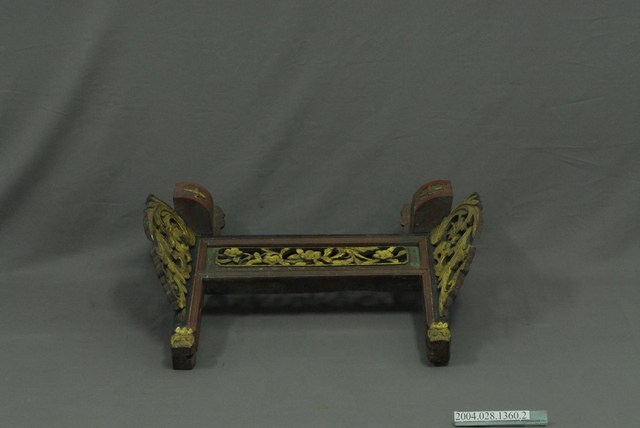本件為公媽龕之底座,木頭製作,有一凹槽可將背板插入,兩旁作外展式八字花草紋透雕,使子孫在觀看時,聚焦於神主牌上。