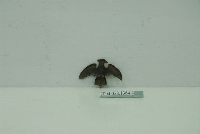 1.本件鷹形裝飾品為日本尾張時計株式会社製木屋造型掛鐘頂端鷹形裝飾,銅製,老鷹側頭展翅形狀,正面上有刻畫老鷹身體及羽毛細節,因年代久遠,氧化痕跡明顯。裝飾品的下方中間有一榫,用來固定在箱體頂端。2.在歐洲,老鷹被認為是洞察力,力量,勇氣和不朽的象徵,最早可追述於古埃及的太陽神形象。歐洲歷史上,雄鷹作為古羅馬帝國、法蘭西第一帝國及後來的德意志帝國國家的圖騰紋飾,是君主權力以及國家的榮耀象徵。