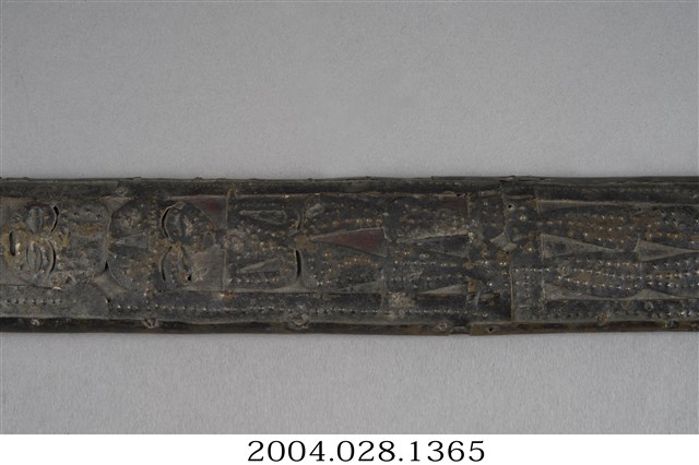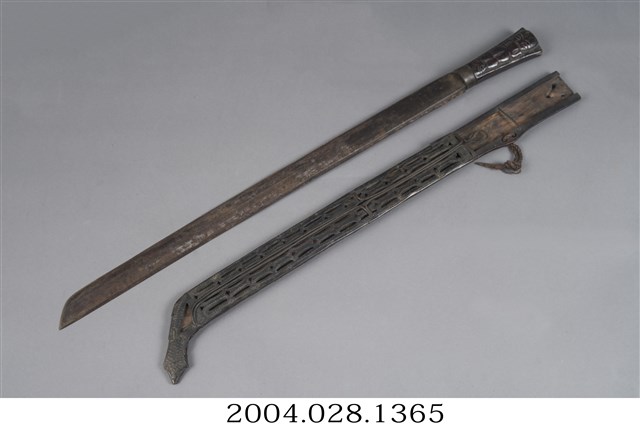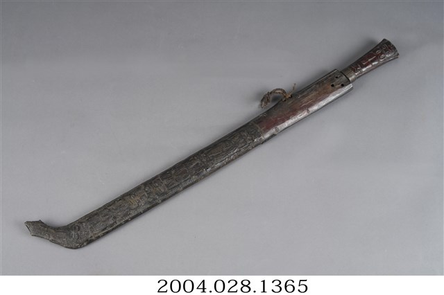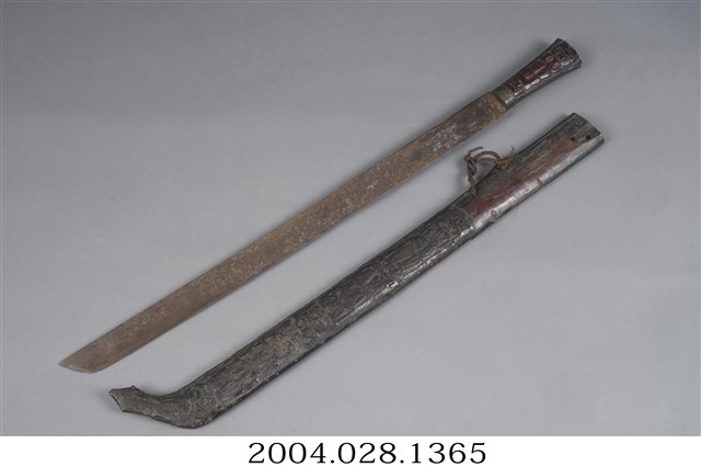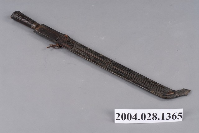 1. 本件藏品為排灣族佩刀。刀身為鐵製,刀柄與刀鞘為木製同時塗以深棕色漆。刀鞘為單面形制,另一面刻有刀槽並有鐵線壓條及鐵片,本刀為單刃形制,刀身細長較直,刀尖向刀背呈一斜切面。刀柄刻有相對人像紋,刀鞘成蛇身狀,刀尖處狀如蛇首,中段至刀尖處釘有對立人像紋鐵片,可見排灣族對於祖先以及百步蛇的敬仰。刀鞘靠近刀柄處有穿孔,其中孔洞已有穿入麻繩綁帶。由於年代久,刀身已有嚴重鏽蝕情況。