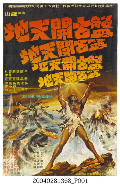 1.臺灣電影《盤古開天地》在臺上映中文彩色海報,為陳子福手繪,海報中間描繪盤古舉起巨石,在此海報中巨石則由盤古開天地此名做石頭裂開的設計,看起來像是盤古舉起了片名,片名層層上去共有四層,背景則是山海大浪,九頭蛇大肆作亂,天地混沌尚未開化的呈現。文案則標住在海報上方邊緣「中國影壇有史以空前大製作,耗資五千萬奇幻特技神話鉅構」。海報狀況不佳,有大量的泛白,看起來像是膠帶貼痕,有兩條明顯摺痕,一上一下,也有些磨損。2.《盤古開天地》於1979年由臺灣永明影業有限公司出品。羅山執導、張永祥、岳華主演。