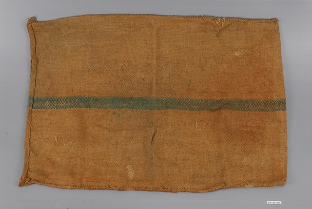 本件麻布袋係以麻類植物纖維製成細線後,再編織成布片縫製而成,以單幅麻布片採短邊疊合對折後,以短邊作開口,於2側長邊緊密縫合完成,開口處另外向外折起作緄邊處理,呈長77公分,寬109.3公分,高5.7公分之直式長方形袋。外觀呈現麻纖維之原色,即為黃褐色。麻布袋雙面中段處皆有1道垂直綠色寬線印刷於表面。麻布袋為傳統裝盛用具,實用性高且用途廣泛,主要用來裝盛各類貨物方便堆疊運輸。