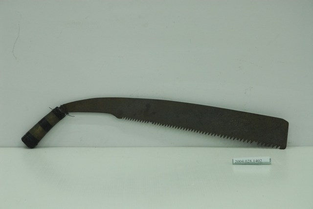 特製」等字。伐木鋸基本特徵為鋸片後端作成鐵條插入木柄,鋸片與木柄呈人字形。本件木柄於修理時以絕緣膠帶圈起加固。鋸齒長度規格有1.6到5.5臺尺等,1.6、1.9臺尺又稱小切或小銑,用來鋸面積較小的坪枋、車樑、建築桁樑等。開剖是將砍倒的樹木縱向切割,因運送木料的木馬或臺車載重量有限,因此在樹木切成適當的長度後,若重量仍過重,則需作縱向切割,以利人力搬運及運輸工具載送。大割鋸通常由樹材左右剖開,鋸片平放作鋸切作業。