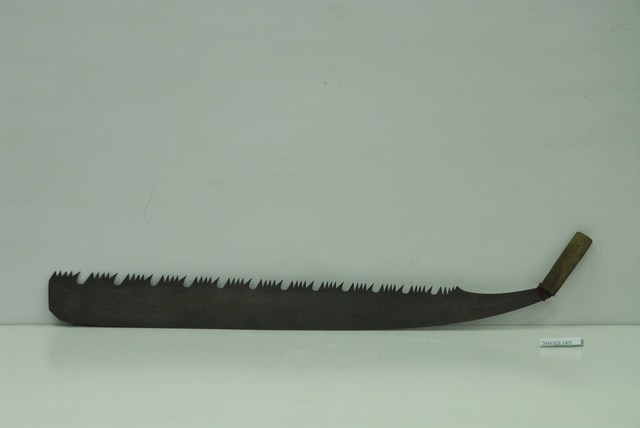 本文物為五齒鉤鋸,又名五齒孔鋸、五齒空鋸,為日本時代1930年由日本引入的伐木用鋸,於砍樹、造材的橫截樹材作業時使用,鋸片上刻有「高級品 特種鋼 竹東 請合」等字,應為竹東林場用鋸。