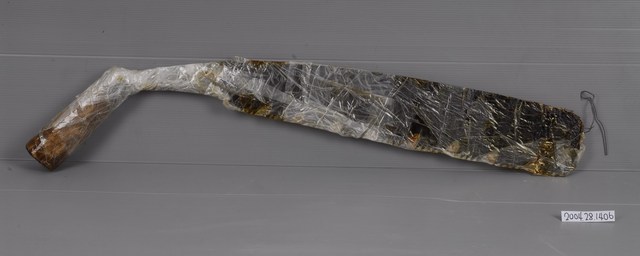 本文物為五齒鉤鋸,又名五齒孔鋸、五齒空鋸,為日本時代1930年由日本引入的伐木用鋸,於砍樹、造材的橫截樹材作業時使用。伐木鋸基本特徵為鋸片後端作成鐵條插入木柄,鋸片與木柄呈人字形。五齒鉤是以鋸齒為五齒及一深鋸溝為一組,連續排列而成,五齒分成四切割齒及一刮鉋齒,深鋸溝可收集木屑,利於橫向截切樹材。鋸齒規格有三尺到七尺。砍樹時先在預計倒下的樹側以斧鑿劍口,再於對側以五齒鉤鋸鋸到樹倒。樹倒後進行造材作業,以五齒鉤鋸將樹材截切成適當的長度。