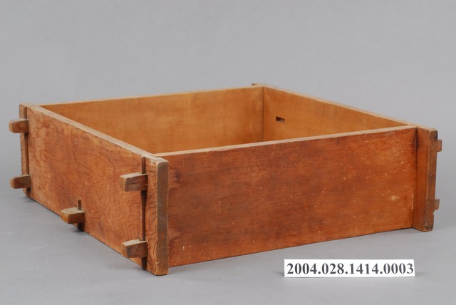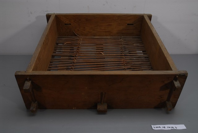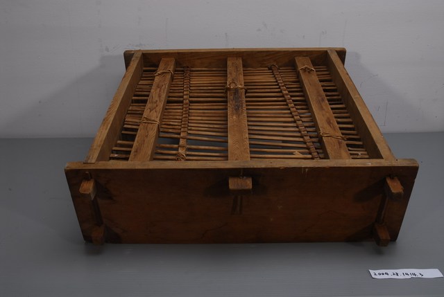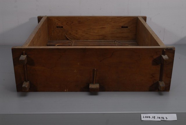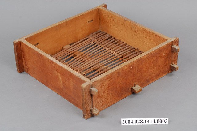 1.本件為方形圓頂木蒸籠組之下層籠身,其周邊呈四角形,可與上層籠身與下層底板接合,以減少蒸氣外洩,結構上以木材接榫製成,層底有長條竹編成的大孔隙底板,用來放置食物。由於籠身上下通透,可使底部沸水的蒸氣貫通籠內但不易外洩,進而達到蒸煮熟食目的。以木料製造的蒸籠容易吸收多餘的水蒸氣以避免附著在食物上,進而使料理更加美味,故而許多不少講求蒸煮風味的廚人,在環境允許下,還是喜用這類的蒸籠。