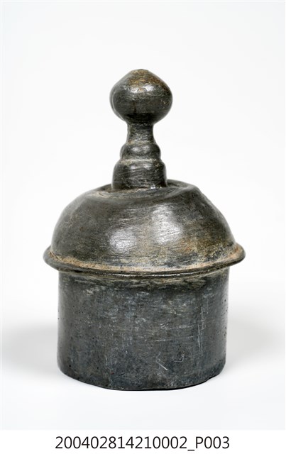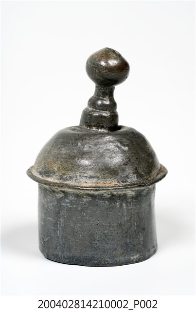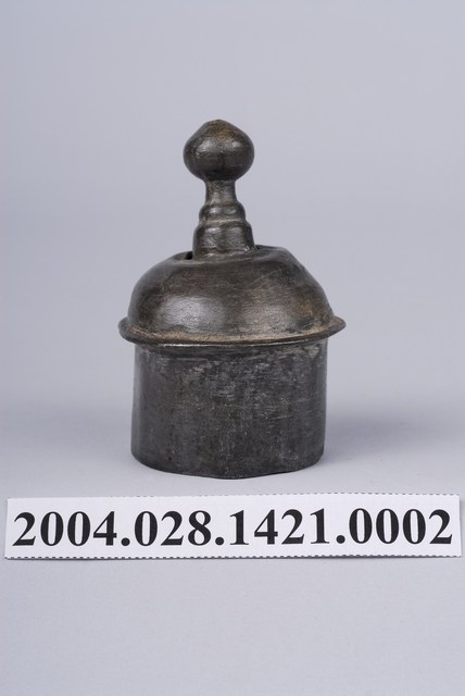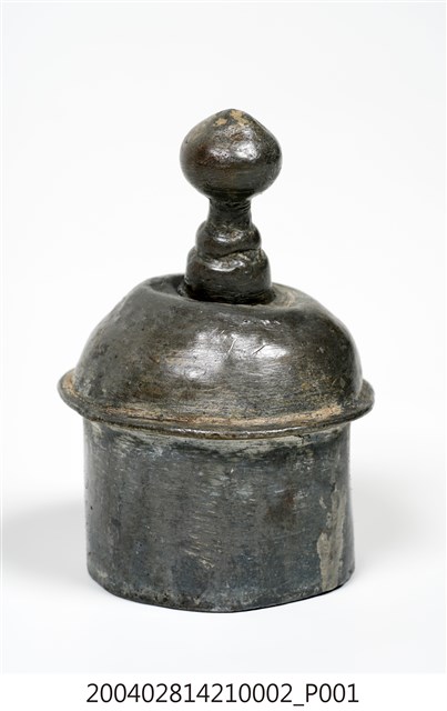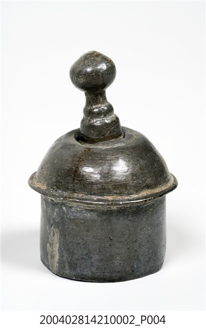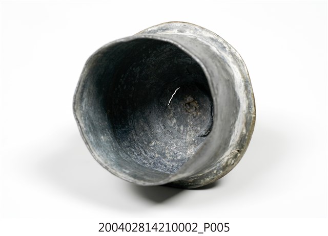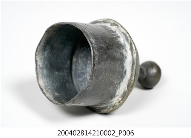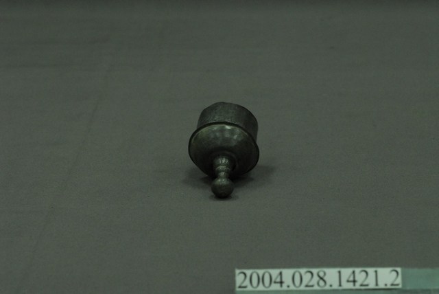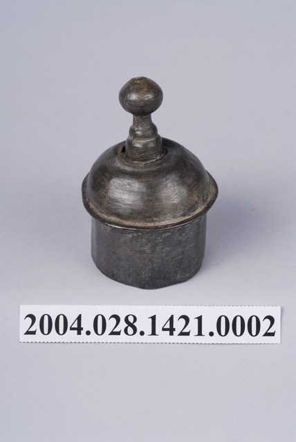 本件為囍字錫壺之壺蓋,呈長4.8公分,寬4.9公分,高7公分。通身以錫金屬製作,現呈霧面暗灰色,蓋身為上窄下寬樣式,其蓋頂凸起,蓋緣向外略微折沿,作虛壓蓋形式。頂面中心處作高頂珠。壺蓋底部帶有高立唇,可與壺身之口部接合,防止壺蓋移動。