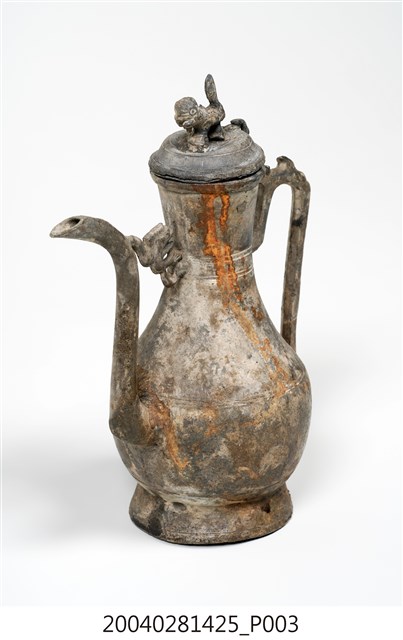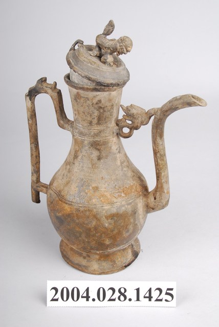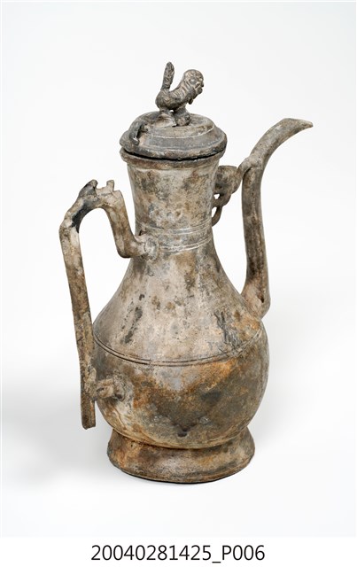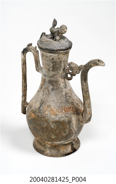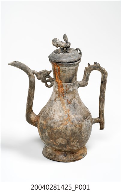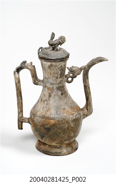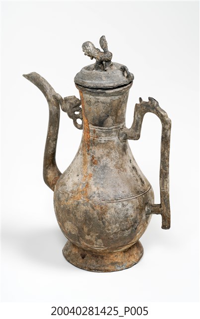 1.獅鈕鳳銜嘴錫壺可分為壺蓋與壺身2部件,通身以錫金屬製作,表面呈黃褐色,略帶紅褐色滴流痕跡。其蓋頂作圓弧凸起,蓋緣作虛壓蓋形式。頂面中心處作獅形鈕,獅形簡陋。器身呈長頸鼓腹,底部為外敞圈足。流身與器身交界處有明顯分界為明嘴樣式,流身則依照彎曲的次數為樣式名稱,本件流身為三彎嘴式,其流嘴呈舌口式。流嘴與器身頸部相連有鳳鳥形飾片,並於流嘴相對處之器身一側,作C形上翹環形手把。