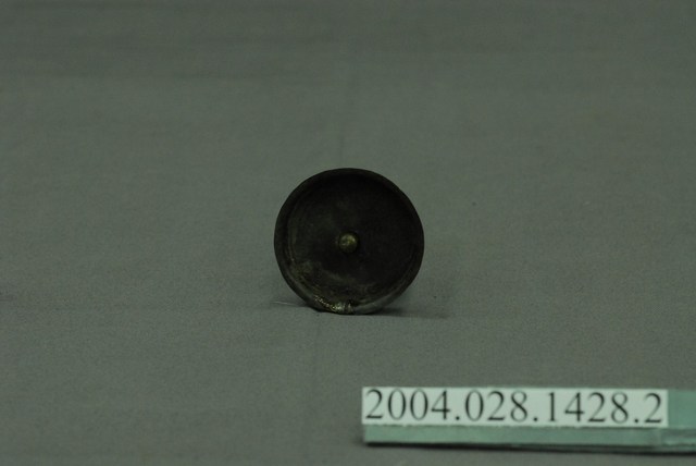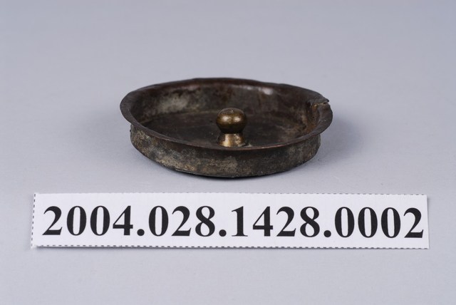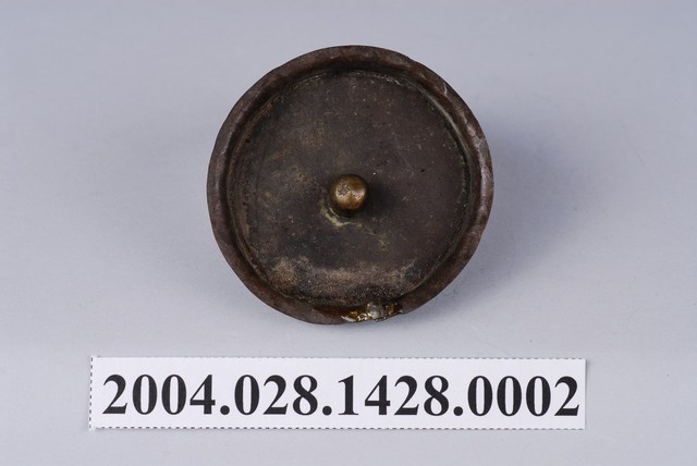 本件為日式丸型錫壺之壺蓋,呈長5.3公分,寬5.2公分,高1公分。通身以錫金屬製作,表面呈深灰褐色,蓋身作圓形內凹,其蓋頂呈圓形平面,與器身口部接合時,蓋壁與蓋頂內凹至口緣內,僅靠蓋緣略為出沿支撐,此樣式為海蓋形式。蓋頂中心處另以黃銅材質作高頂珠樣式。