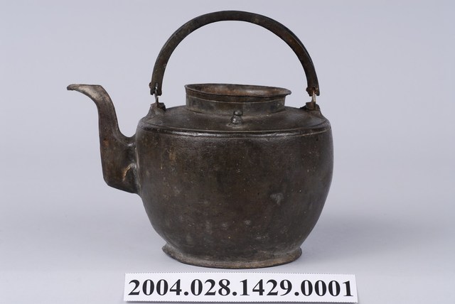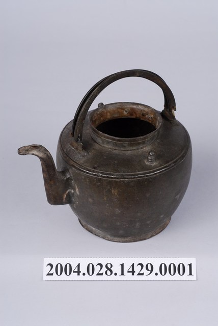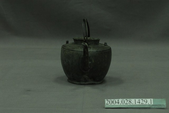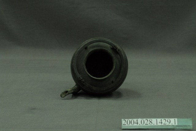 本件為日式丸型錫壺之壺身,長15.9公分,寬11.9公分,高10.2公分。通身以錫金屬製作,表面呈黑灰色。器身呈圓口短頸,頸部中段帶有一道弦紋,肩部呈斜肩轉折下接鼓腹球身,轉折處另以兩道弦紋裝飾,底部作圓形外撇短圈足。流身與器身交界處有明顯分界為明嘴樣式,流身則依照彎曲的次數為樣式名稱,本件流身為二彎嘴式,其流嘴呈尖狀舌口樣式。器身頂端兩側與流嘴呈垂直處作立耳,並以兩條半圓形寬帶狀金屬作提樑式手把,呈左右對開樣式。