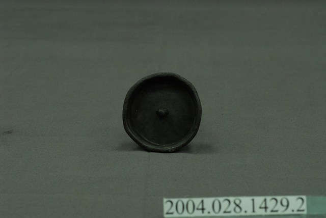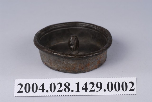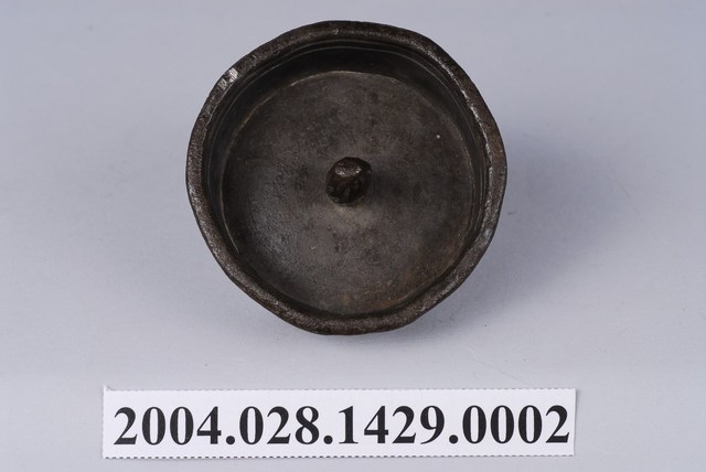 本件為日式丸型錫壺之壺蓋,長6.2公分,寬6.公分,高1.9公分。通身以錫金屬製作,表面呈黃褐色,蓋身作圓形內凹,其蓋頂呈圓形平面,與器身口部接合時,蓋壁與蓋頂內凹至口緣內,僅靠蓋緣略為出沿支撐,此樣式為海蓋形式。於接近口緣處帶有一道弦紋,蓋頂中心處作花苞樣式的鈕蓋。