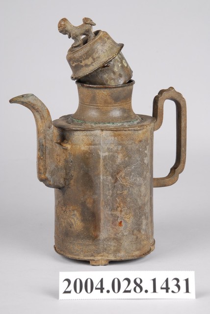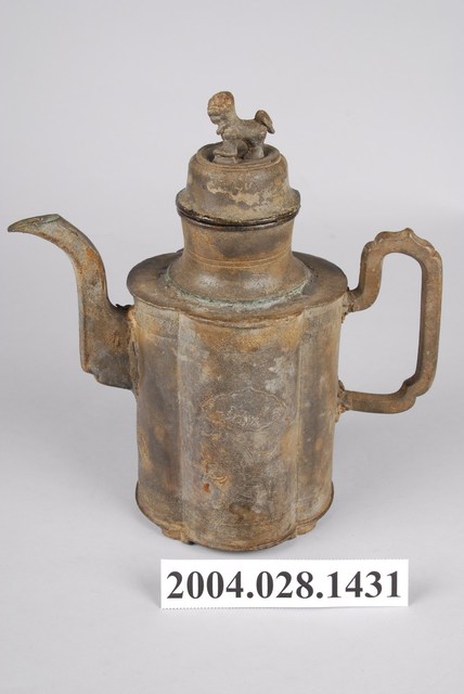 1.獅紐魚蟹紋錫壺可分為壺蓋與壺身2部件,通身以錫金屬製作,表面呈黃褐色。其蓋頂凸起,頂面置有獅形鈕,蓋緣略為出沿作虛壓蓋形式。器身呈圓口短頸,下接四瓣花形口長筒狀,底部於器身轉角處作矮板足。流身與器身交界處有明顯分界為明嘴樣式,流身則依照彎曲的次數為樣式名稱,本件流身為三彎嘴式,其流嘴呈尖狀舌口狀。於流嘴相對處之器身一側,作C形上翹環形手把。