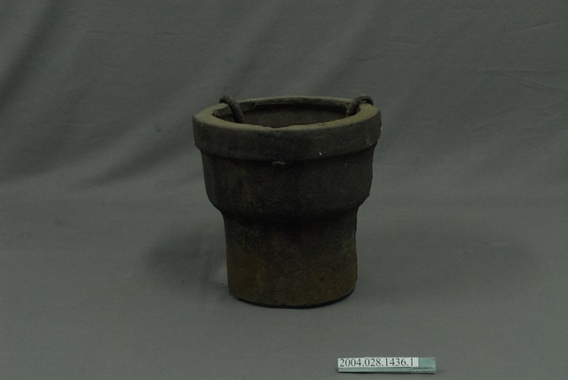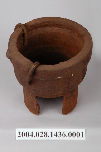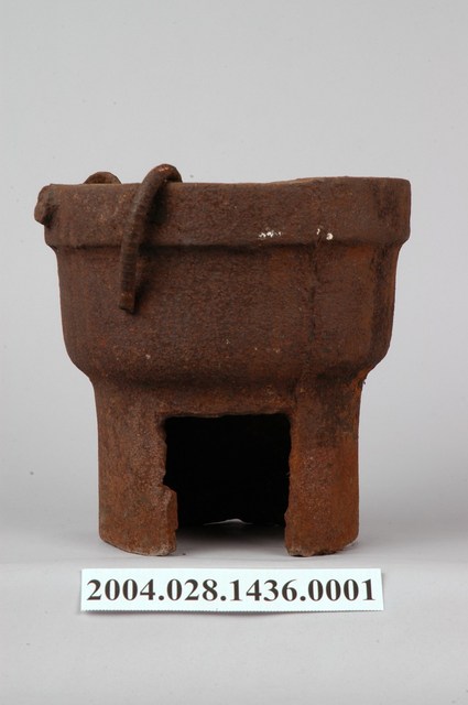 本物件為生鐵爐器具的主體,外觀為中空圓柱狀,爐頂邊緣裝有兩條外掛鐵條;生鐵爐底部略收窄,下方有一個方形風口,由此送風有助於炭火的燃燒。