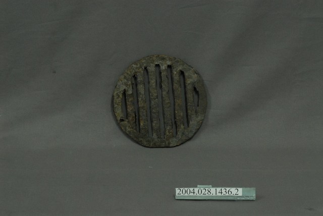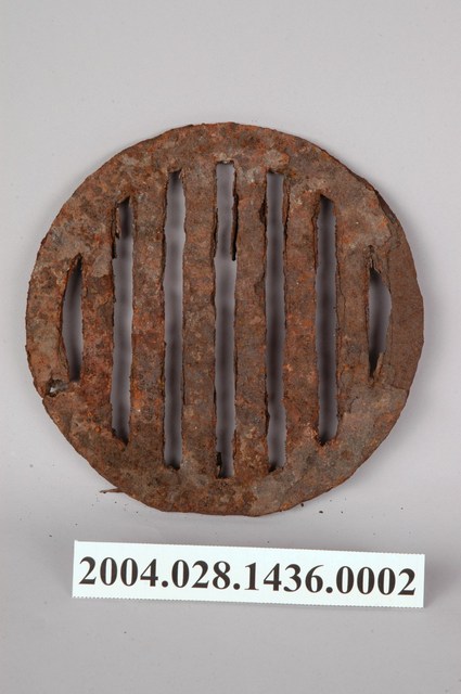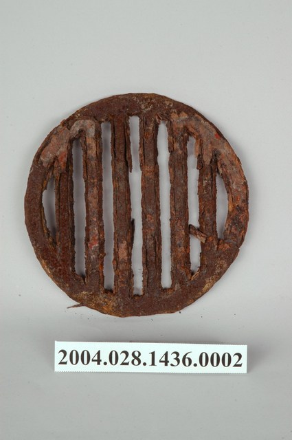 本物件為生鐵爐器具的隔層鐵片,外型呈鏤空條狀圓形底盤,使用時置於生鐵爐中,再將木炭放在鐵片上。