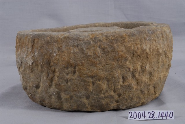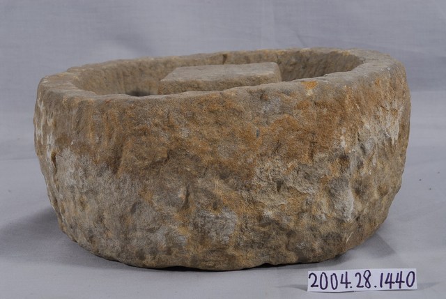 1. 本藏品為四件一組的石製桌腳墊,長22.9公分、寬22.7公分、高10.1公分,外形為圓鼓形,內有溝槽,溝槽內則有方形突起。材質為紅褐色岩石,無裝飾,體外遍佈鑿石工具痕跡與使用磨損痕跡,整體而言造型簡單樸實。2. 桌腳墊又稱為蟻除、櫥仔腳,是漢人傳統社會中,用來墊在飯桌、菜櫥腳下,多為四件一組,墊內有溝槽,注水即可防止蟻蟲攀爬。外型多為圓形,內部突起則有方有圓,用以支撐桌腳,材質有陶製、石製、瓷製等。