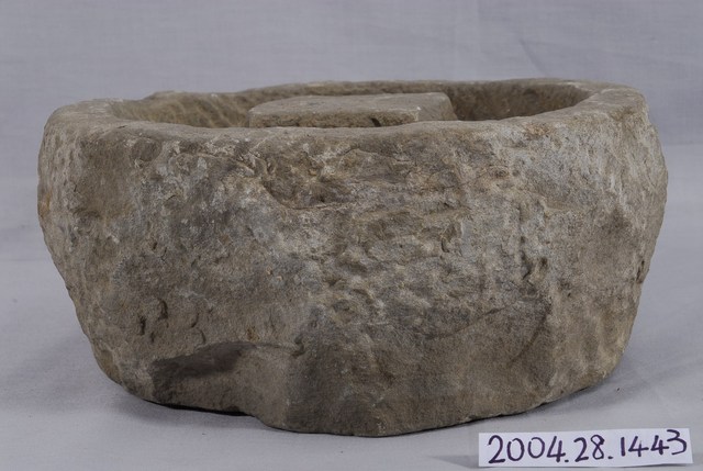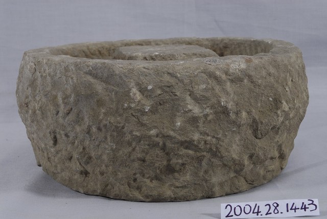 1. 本藏品為四件一組的石製桌腳墊,長22.5公分、寬22.3公分、高9.7公分,外形為圓鼓形,內有溝槽,溝槽內則有方形突起。材質為紅褐色岩石,無裝飾,體外遍佈鑿石工具痕跡與使用磨損痕跡,整體而言造型簡單樸實。2. 桌腳墊又稱為蟻除、櫥仔腳,是漢人傳統社會中,用來墊在飯桌、菜櫥腳下,多為四件一組,墊內有溝槽,注水即可防止蟻蟲攀爬。外型多為圓形,內部突起則有方有圓,用以支撐桌腳,材質有陶製、石製、瓷製等。