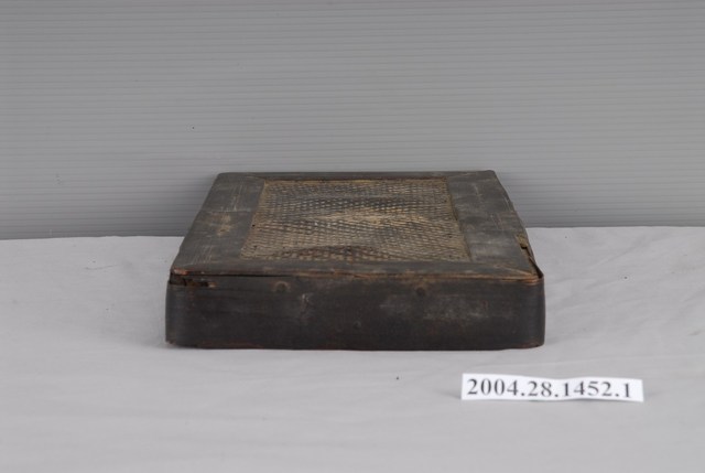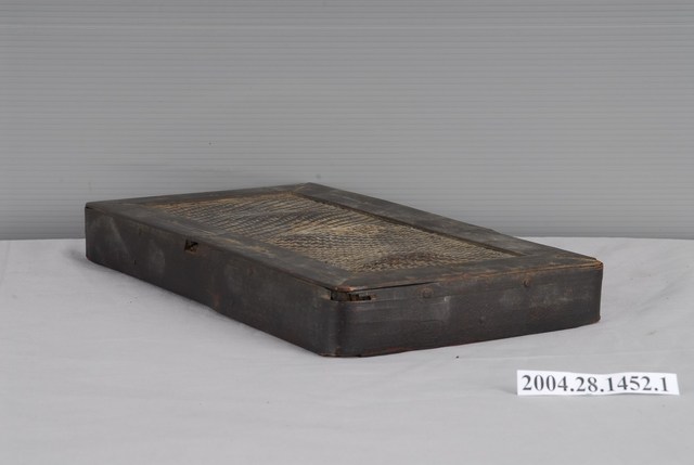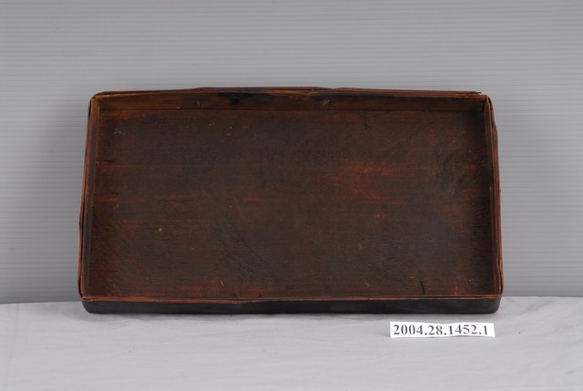 本件為三層長方竹製提籃之淺蓋,通體以竹篾、竹條與木板拼接製做而成,竹篾為盒蓋外側頂面中間的部分,採壓二挑二斜紋編法密編,竹條為盒蓋外側頂面的邊框與邊圍部分,有打釘加固,木板為盒蓋內側的頂面與邊圍部分。竹篾、竹條、木板處皆刷有黑漆,使具有防潮防蛀效果。盒頂竹篾處卡有許多黃泥,漆面有龜裂與脫落,竹條則有部分破裂的狀況。