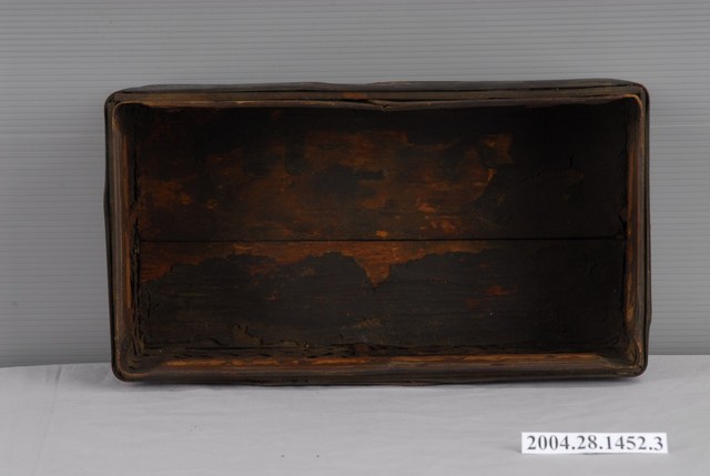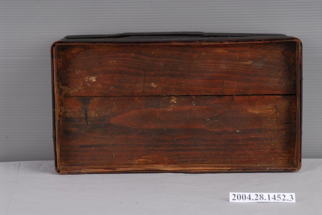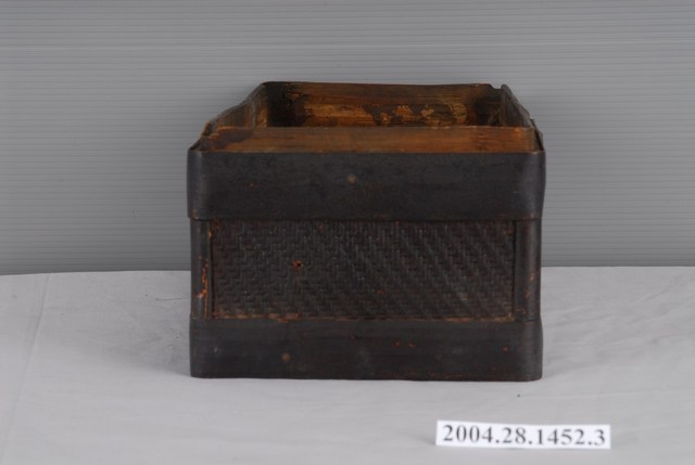本件為三層長方竹製提籃之中層,通體以竹篾、竹條與木板拼接製作而成。竹篾為盒身外側壁面部分,採壓二挑二斜紋編法密編;竹條為盒身外側的上下邊框、轉角邊的欄條以及盒身內側口緣做成子母口的部分,有打釘加固。木板拼接為盒身內側邊壁與底層部分。竹篾、竹條、木板處皆刷有黑漆,使具有防潮防蛀效果。因年代久遠,漆面有龜裂與脫落,盒身底部的木板有裂痕,盒身口緣的竹條在角邊有明顯破裂的狀況。