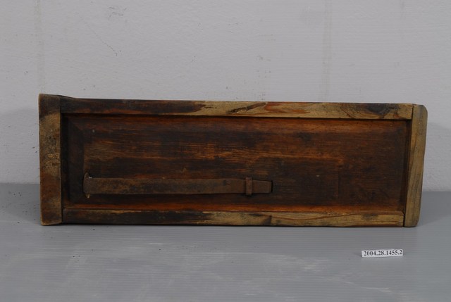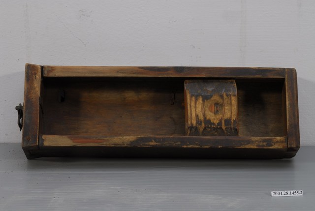 1.本件為補鼎攤木箱之上層抽屜,外觀整體狹長,呈長方體,平底,正面與背面呈上窄下寬的梯形,並有使用過的熏黑痕跡,內部中空,接近抽屜背面處附有一小段頂蓋,可防止抽屜在抽取移動時,盛裝在內的工具掉落。側面與底部因平時收納於櫃體中而較接近原狀,可見自然的木紋。在材質上,整體以木片製成,正面附有一菊瓣形的金屬配件,其上連接一鏤空心形環,以方便拉開抽屜。