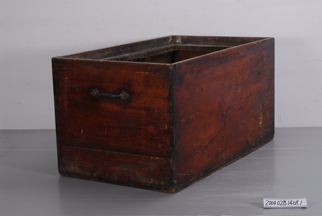 本文物為木製冰箱主體,長方形木製結構,有相當厚度,短邊兩側栓有鐵製把手,能夠提取挪動,表面光滑沒有圖紋裝飾。