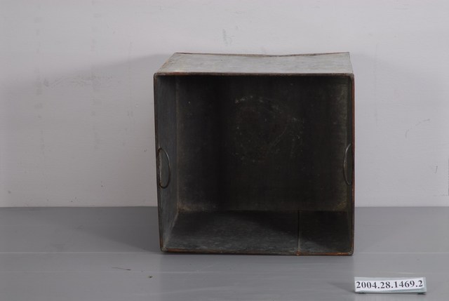 本文物為木製冰箱內鐵箱,鐵製正方體,內側頂端栓有兩個半圓形扣還在相對位置,方便提拿,整體內外有多處鏽蝕。