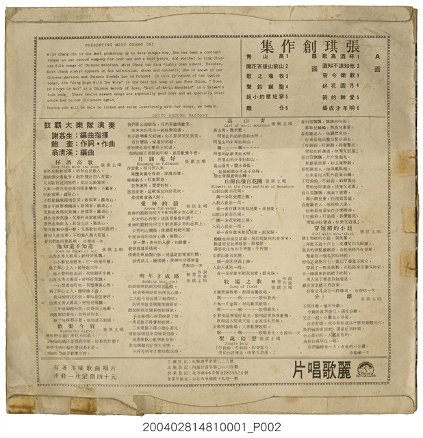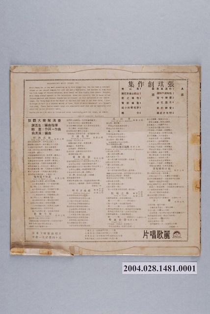 2004.028.1481.0001 麗歌唱片廠出品編號「AK-637」華語歌曲專輯《張琪創作集:杯酒高歌》唱片封套