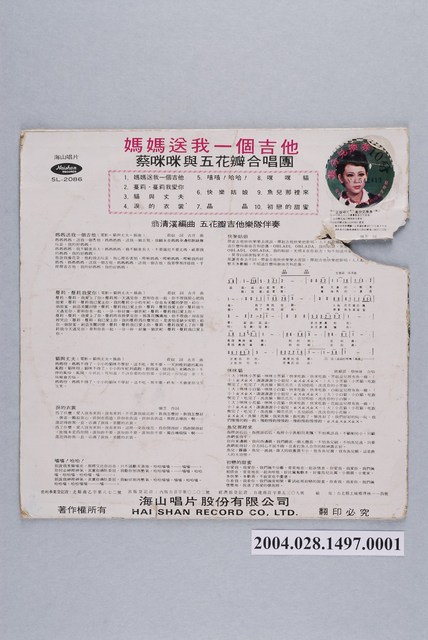 海山唱片公司出品編號「SL-2086」華語歌曲專輯《媽媽送我一個吉他》唱片封套
