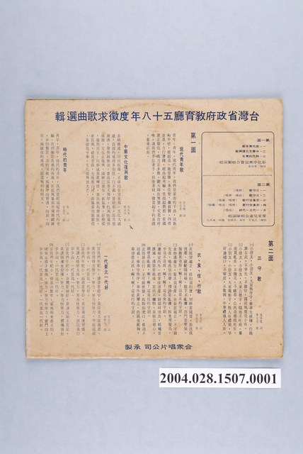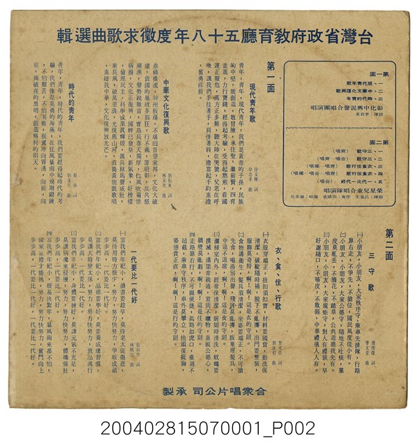 合眾唱片公司製作、中興混聲合唱團、榮星兒童合唱團演唱、臺灣省政府教育廳發行
