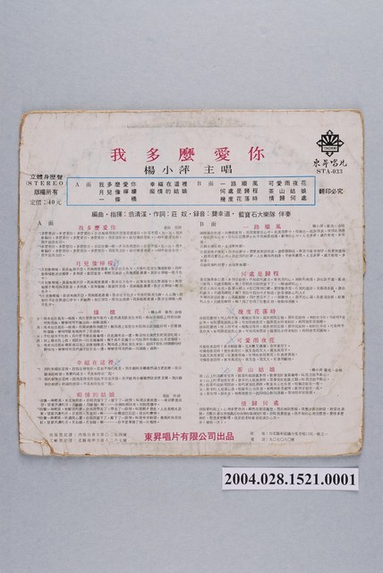 東昇唱片公司(位於臺北縣新莊鎮)發行編號「STA-033」華語歌曲專輯《楊小萍金唱片第11集:我多麼愛你》唱片封套。封套正面印有「楊小萍金唱片第11集」,主打歌曲為〈月兒像檸檬〉、〈我多麼的愛你〉、〈一路順風〉,背面註明「編曲、指揮:翁清溪。作詞:莊奴。錄音:龔幸道。藍寶石大樂隊 伴奏」,「立體身歷聲。定價:40元」。