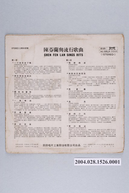 2004.028.1526.0001 鈴鈴唱片工業股份有限公司發行編號「RRLP-2050」華語歌曲專輯《陳芬蘭與流行歌曲》唱片封套