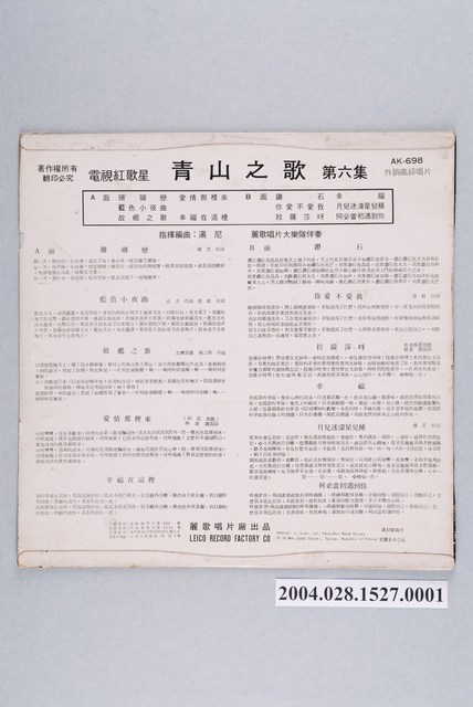 麗歌唱片廠出品編號「AK-698」華語歌曲專輯《青山之歌第六集》12吋塑膠唱片