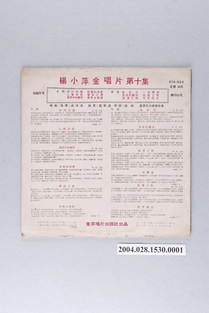 東昇唱片公司發行編號「STA-024」華語歌曲專輯《楊小萍金唱片第十集:淚的衣裳》