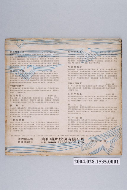 33轉、12吋、國語流行歌、美酒加咖啡、高山不了情、我的情人夢