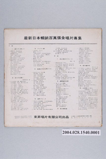 東昇唱片公司發行編號「MXL-2153」日語歌曲專輯《最新日本暢銷百萬張金唱片》12吋塑膠唱片