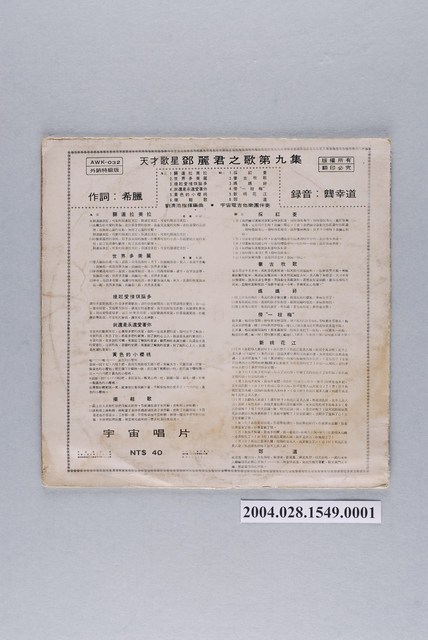 宇宙唱片公司發行編號「AWK-032」華語歌曲專輯《鄧麗君之歌第九集》12吋塑膠唱片