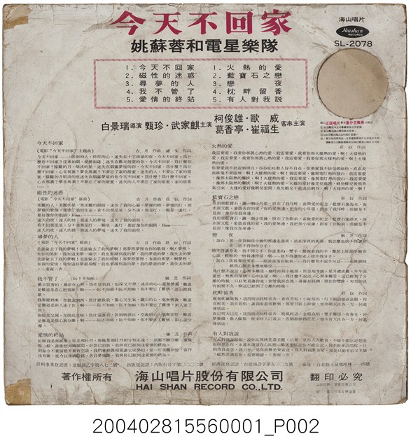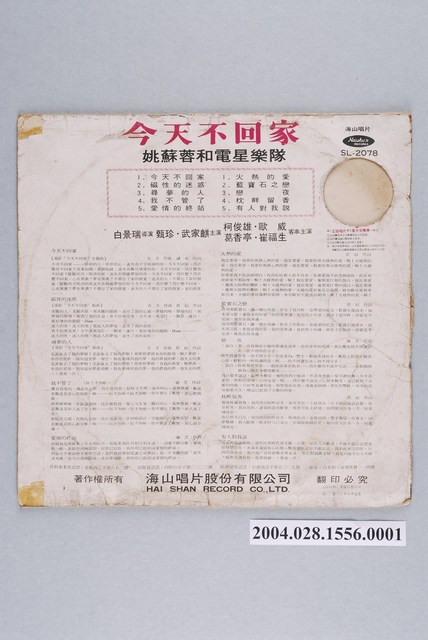 海山唱片公司發行編號「SL-2078」華語歌曲專輯《今天不回家》