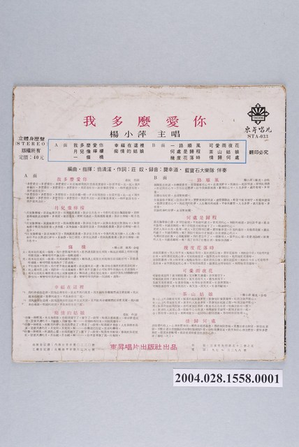 東昇唱片公司(位於臺北縣三重市)發行編號「STA-033」華語歌曲專輯《楊小萍金唱片第11集:我多麼愛你》唱片封套。封套正面印有「楊小萍金唱片第11集」,主打歌曲為〈月兒像檸檬〉、〈我多麼的愛你〉、〈一路順風〉,背面註明「編曲、指揮:翁清溪。作詞:莊奴。錄音:龔幸道。藍寶石大樂隊 伴奏」,「立體身歷聲。定價:40元」。