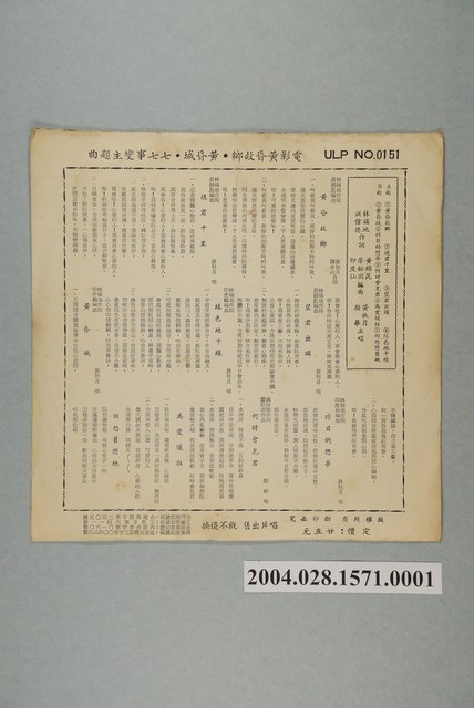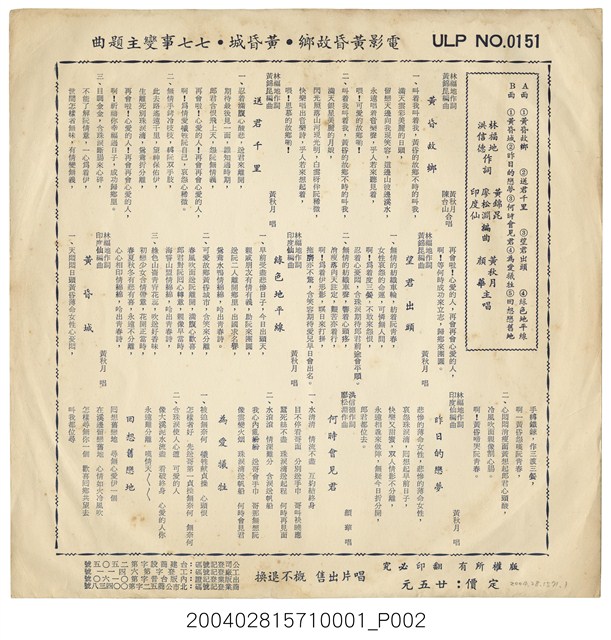 33轉、10吋、臺語流行歌、電影歌曲、林福地、洪信德、黃錦昆、廖松淵、印度仙、黃秋月、陳台山、顏華