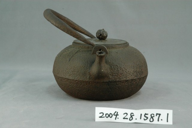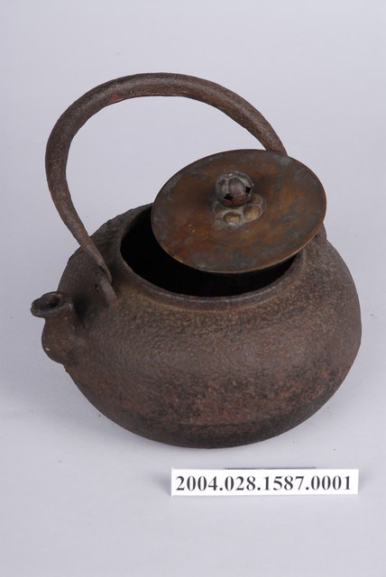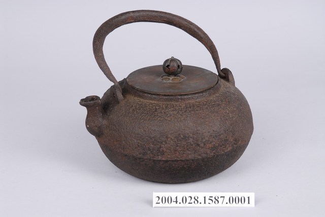 本件平丸型鐵壺,可分為壺身與壺蓋2部分,為長火缽用溫酒煮水鑄鐵茶具組部件之1,呈高17.7公分,寬18.9公分,高11公分。壺身表面呈粗糙的黑褐色,帶有鏽紋。外型呈現上下扁狀的圓球形,口部呈圓口短頸,底部呈平面,器腹中段帶有明顯的鑄造線,流身作明接樣式,為二彎嘴,流嘴呈尖狀舌口狀。接近口緣兩側相對處,與流嘴呈直線,作立耳,以彎鉤固定半圓形鐵製手把作提樑式。壺身一側作竹葉紋裝飾。壺蓋以黃銅製作,呈平面式的罩蓋樣式,頂面中心處作以兩個相對花瓣呈鏤空球形裝飾。