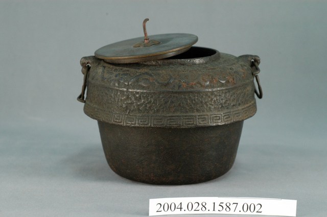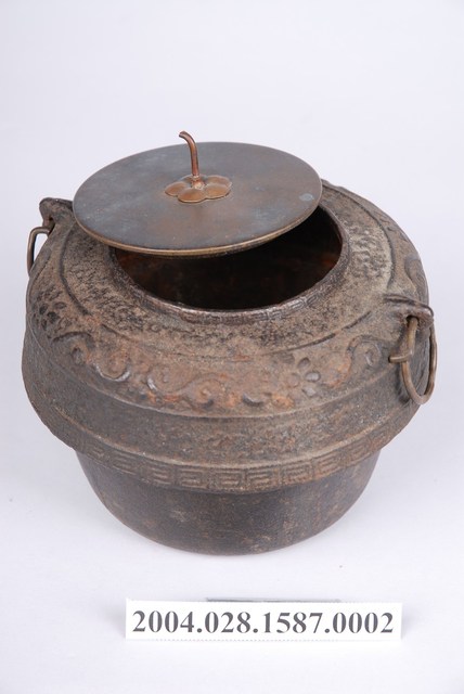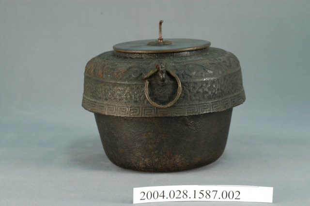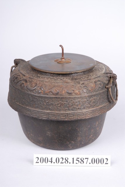 本件連枝紋鐵釜,可分為釜身與釜蓋2部分,為長火缽用溫酒煮水鑄鐵茶具組部件之2,呈14.8公分,寬14.3公分,高12.8公分。釜身呈圓筒形,口緣作短口,表面以回紋裝飾,肩部作圓弧折肩,以連枝花紋裝飾,器身中段以回紋裝飾,並作內轉折,用以放置於爐架之上支撐。中段收束後下半身呈上寬下窄之平底筒形。於肩部左右兩側附有黃銅圓環作提手。釜蓋以黃銅製作,呈平面式的罩蓋樣式,頂面中心處作果蒂造型作鈕。