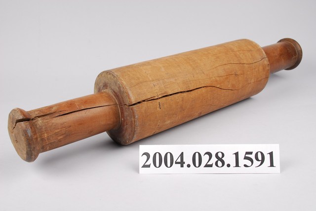 1.本物件為木製碾輾藺草的工具,又稱「研槌」。目的在使藺草原料柔軟、易編。使用研槌比使用木槌節省力氣。研槌兩邊均有手把,木槌則僅一邊有手把。