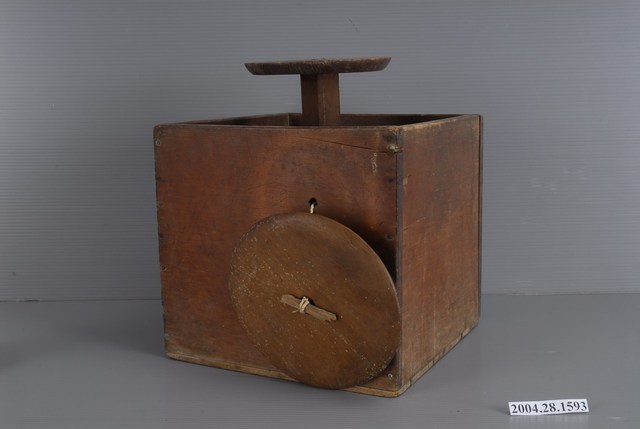 1.本物件為編製藺草草帽的木製模具,包含帽撐、連帽撐的帽箱2個部分。帽撐,由木棒上下接合2個圓輪組成,2端圓輪大小不同,俗稱「車輪」。帽撐是草帽起底後,編製帽管時使用,編帽婦女習用雙腿夾住帽撐2端,其中1端支撐帽底,然後依規格編製帽管。有些地區婦女習慣上將單一帽撐圓輪釘在木箱上使用,組成「連帽撐的帽箱」來編製帽管。