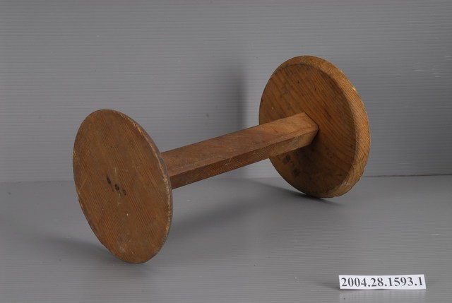 1.本物件為編製藺草草帽的木製模具,稱為「帽撐」。帽撐,由木棒上下接合2個圓輪組成,2端圓輪大小不同,俗稱「車輪」。帽撐是草帽起底後,編製帽管時使用,編帽婦女習用雙腿夾住帽撐兩端,其中1端支撐帽底,然後依規格編製帽管。有些地區婦女習慣上將單一帽撐圓輪釘在木箱上使用,組成「連帽撐的帽箱」來編製帽管。