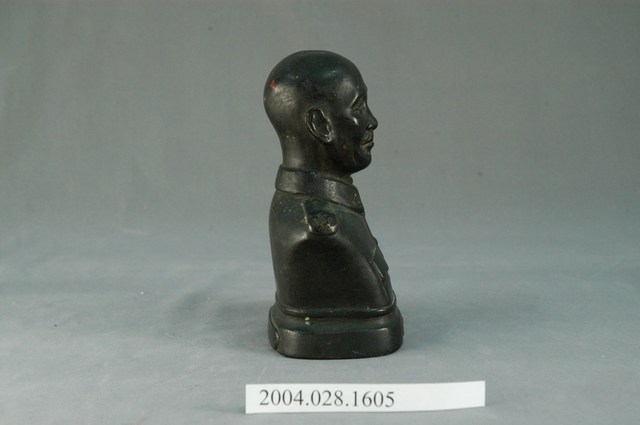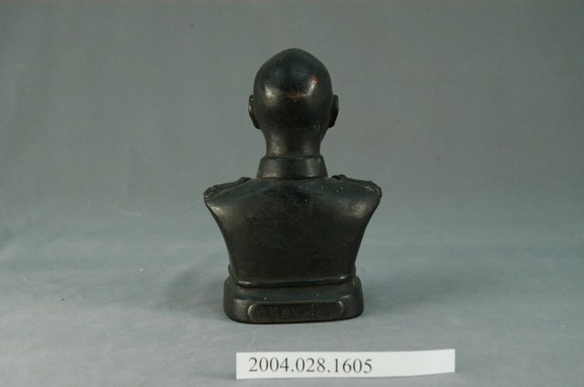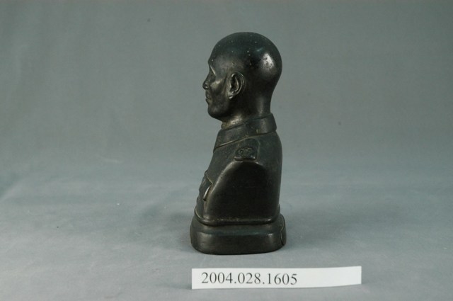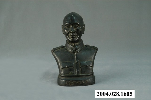 此物件為蔣中正半身胸像,以深色金屬鑄成,底座部分之前端鑄有「偉大領袖」字樣,題字者為于右任,後端則留有鑄造者的署名「臺南徐寶港鑄造」。 此件文物的主要人物為蔣中正,生於1887年10月31日,浙江奉化人,原名瑞元,後改名中正,字介石,擔任中華民國自行憲開始的第一至第五任總統,並連續擔任中國國民黨總裁。蔣中正早年考送日本振武學校,並在1907年加入中國同盟會,其後參加孫文的中華革命黨,在「六一六事變」後成為孫文心腹,並且參與創建黃埔軍校。孫文死後,蔣中正擔任北伐總司令,率領國民革命軍成功北伐,領有中國大部份領土,後於1937年率軍對抗日軍侵略,並獲得勝利。1949年,中國國民黨在第二次國共內戰中失利,蔣中正和中華民國政府撤退臺灣,在臺發布《動員戡亂臨時條款》,實行長達38年的戒嚴令。臺灣社會在戒嚴時期經歷的權威專制,史稱「白色恐怖」。蔣中正於1975年4月5日去逝,其對於中國近代史以及東亞史發展有著深刻影響。