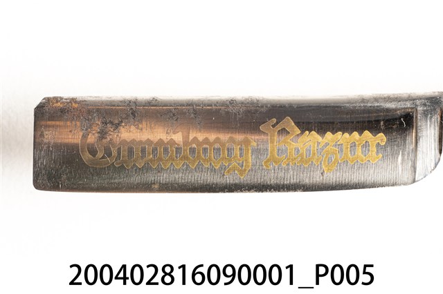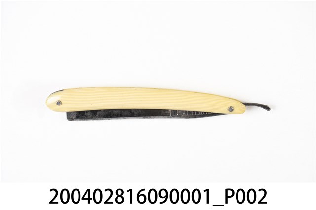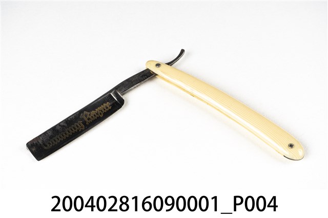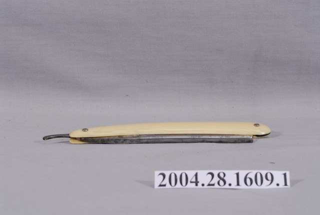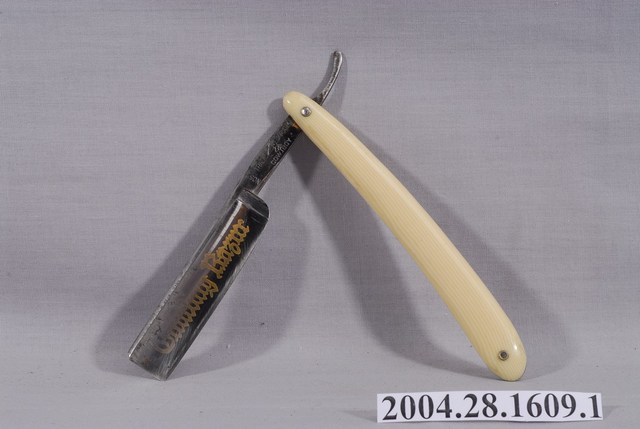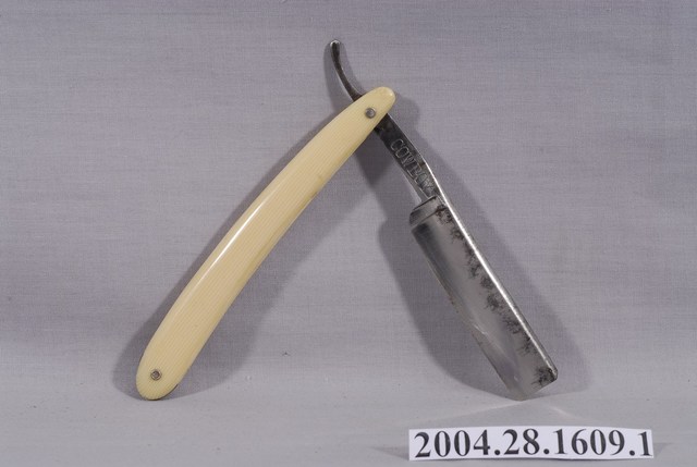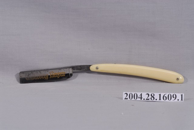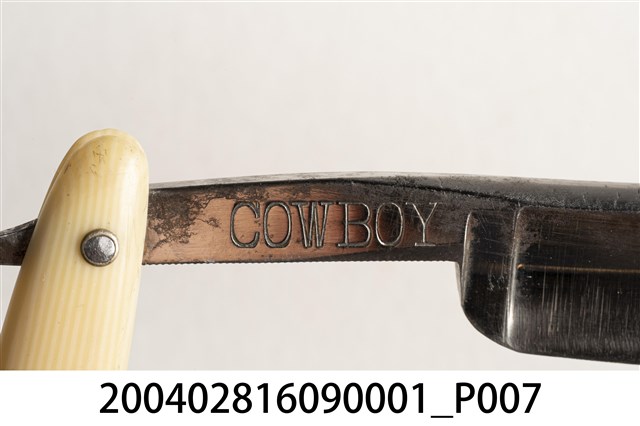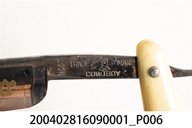 本件德國製象牙柄直式剃刀可分為刀身跟刀柄2部分,刀身以鋼打造,呈現亮銀色澤,刀身外型為厚脊長條形薄片狀,刀身前端延伸出薄型刀鋒,刀身側上刻印有「Cowboy Razor」金色英文字樣,刀頸處則刻有牛仔商標圖及「No.57」字樣,刀尾端成條型起翹,方便持刀者握持使用。刀柄以2片淡黃色的長條形的象牙薄片組合而成,刀柄兩端鑽孔並插入金屬鉚釘,一端與刀頸固定。兩片象牙片中央有溝槽空間可折疊收納刀身。