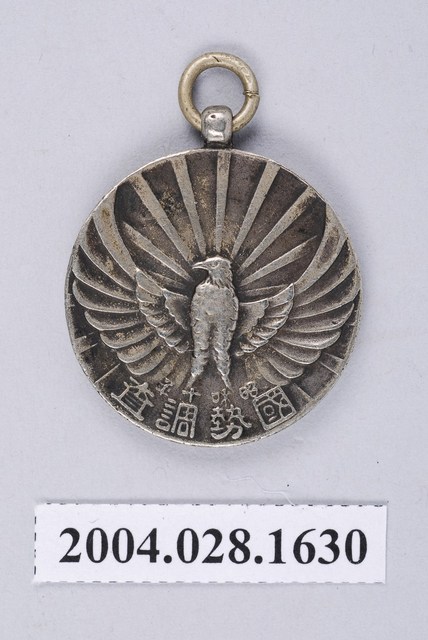 此物件為身份證明章,為一枚圓形徽章,正面鑄有雄鷹圖像與「昭和十年國勢調查」字樣,背面則有「臺灣總督府」字樣。 此件所提及的「國勢調查」為日本於1920年開始舉行的全國人口普查,並以「國勢調查」一詞沿用至今。日本原先準備於1905年準備進行首次人口普查,但日本本土的中央政府並不積極,且日俄戰爭爆發,因此僅有臺灣總督府對臺灣進行人口普查。直到1920年日本才舉行第一次對領有國土的全面調查,其中包含日本本土、朝鮮(韓國)、臺灣,從此之後便每隔五年進行一次國勢調查,且分為每十年(1920、1930、1940等)的大規模調查,以及每十年(1925、1935、1945等)的簡易調查。 日治時期的臺灣人口普查始於1905年10月1 日的「臨時臺灣戶口調查」,之後直至1915年才又舉行人口普查,另外針對原住民的人口普查則至1925年才正式開始。而1920年的首次調查中,其調查內容大多與日本本土相同,但多出數項臺灣專有的調查項目,如:「種族」、「臺灣語言的能力」、「日語能力」、「日語假名讀寫能力」、「鴉片」、「纏足」等。(富田哲。2012。4-5)