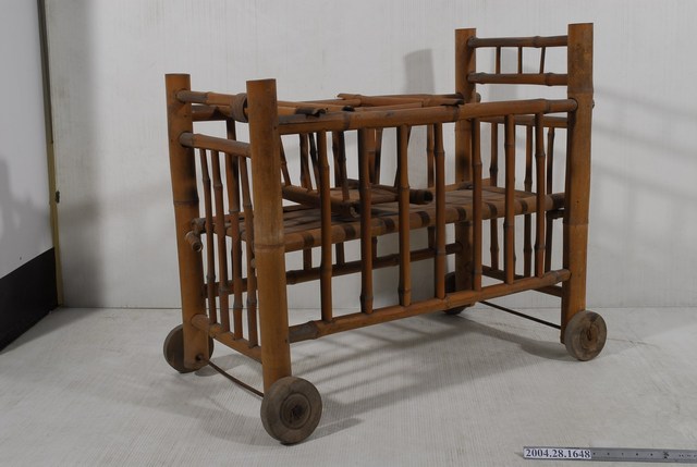 本文物為竹製嬰兒床含活動式小竹椅,整體架構皆由不同粗細的竹子卡榫而成,善用中間床面的空間,架上一張活動式的小竹椅,一體兩用讓幼童能坐能臥。早期多用天然資源製成民生用品,竹生長快速、結構堅韌的特性,使其被普遍運用。