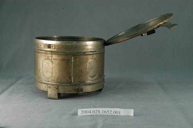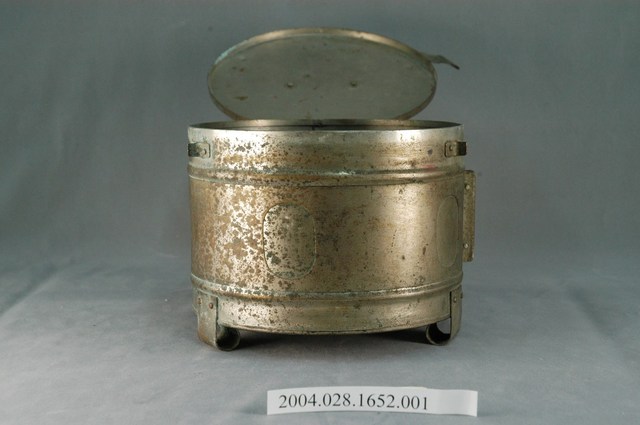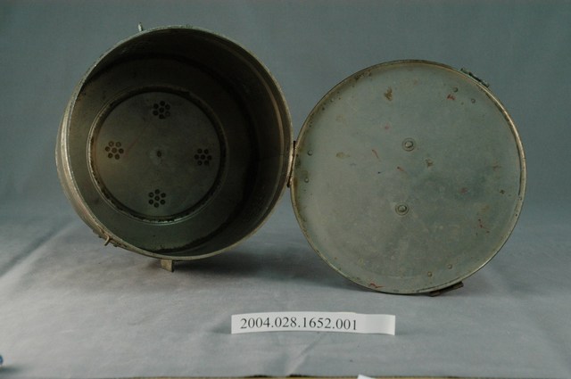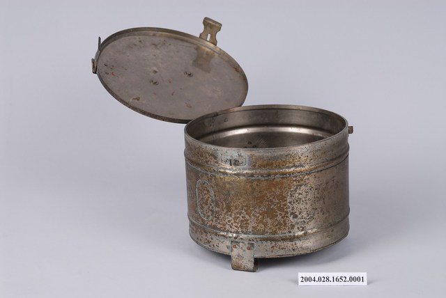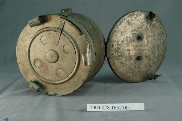 本物件為消毒筒主體,與棉花使用有關。此為金屬材質。外觀為圓筒狀,有一個蓋子,蓋子與筒身不可分開。蓋子上有2個扣環,可以扣住筒身。