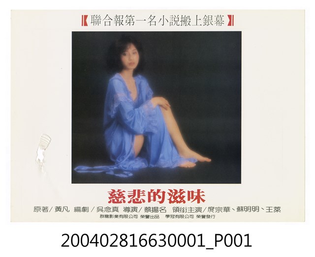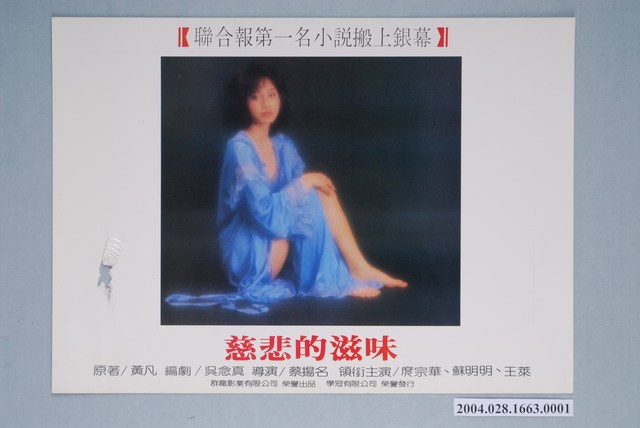 本件劇照上方搭配文案「聯合報第一名小說搬上銀幕」,下方則另有中文片名「慈悲的滋味」,以及「原著 / 黃凡。編劇 / 吳念真。導演 / 蔡揚名。領銜主演 / 庹宗華、蘇明明、王萊」,「群龍影業有限公司出品、學冠有限公司榮譽發行」等字樣。